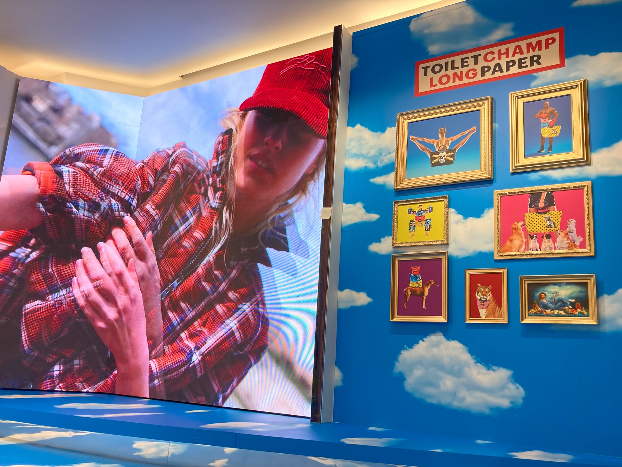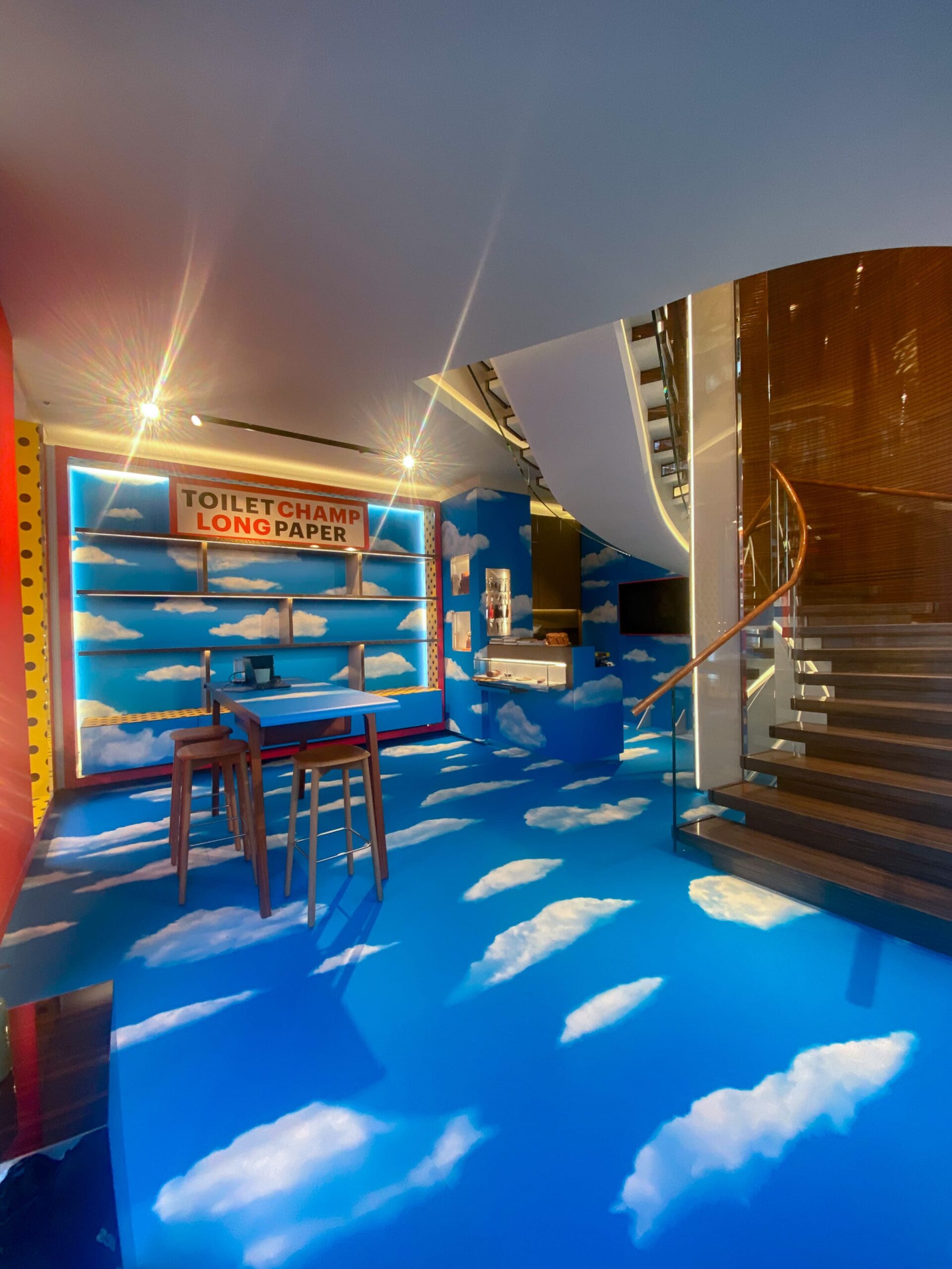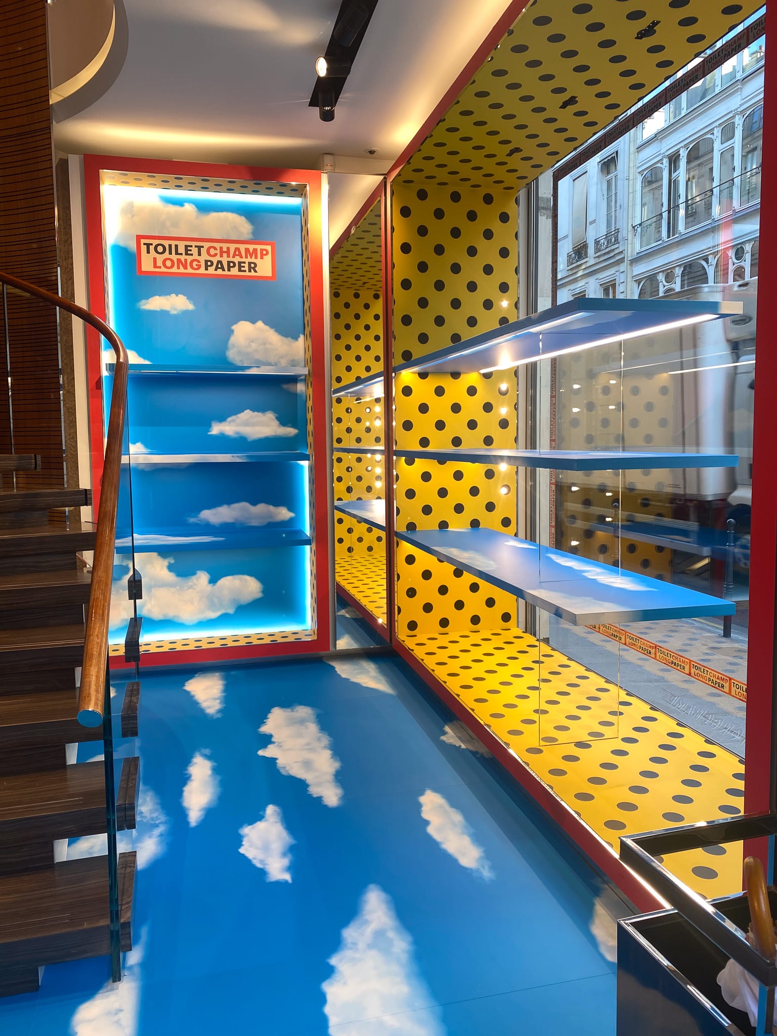 The floors, walls, furniture, shop windows, etc. were covered with visuals produced entirely in our workshops on adhesive tape and UV-printed rigid panels.
