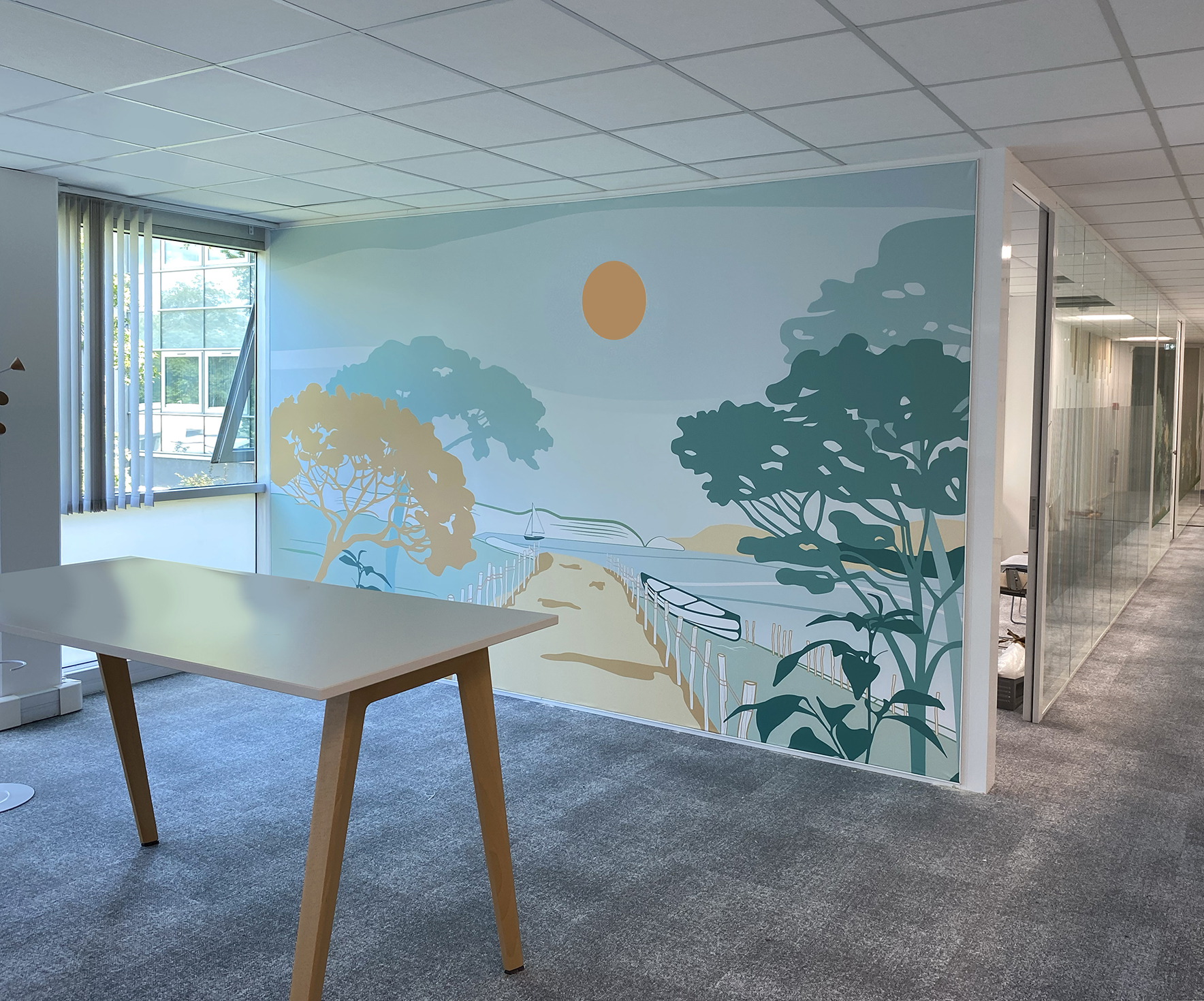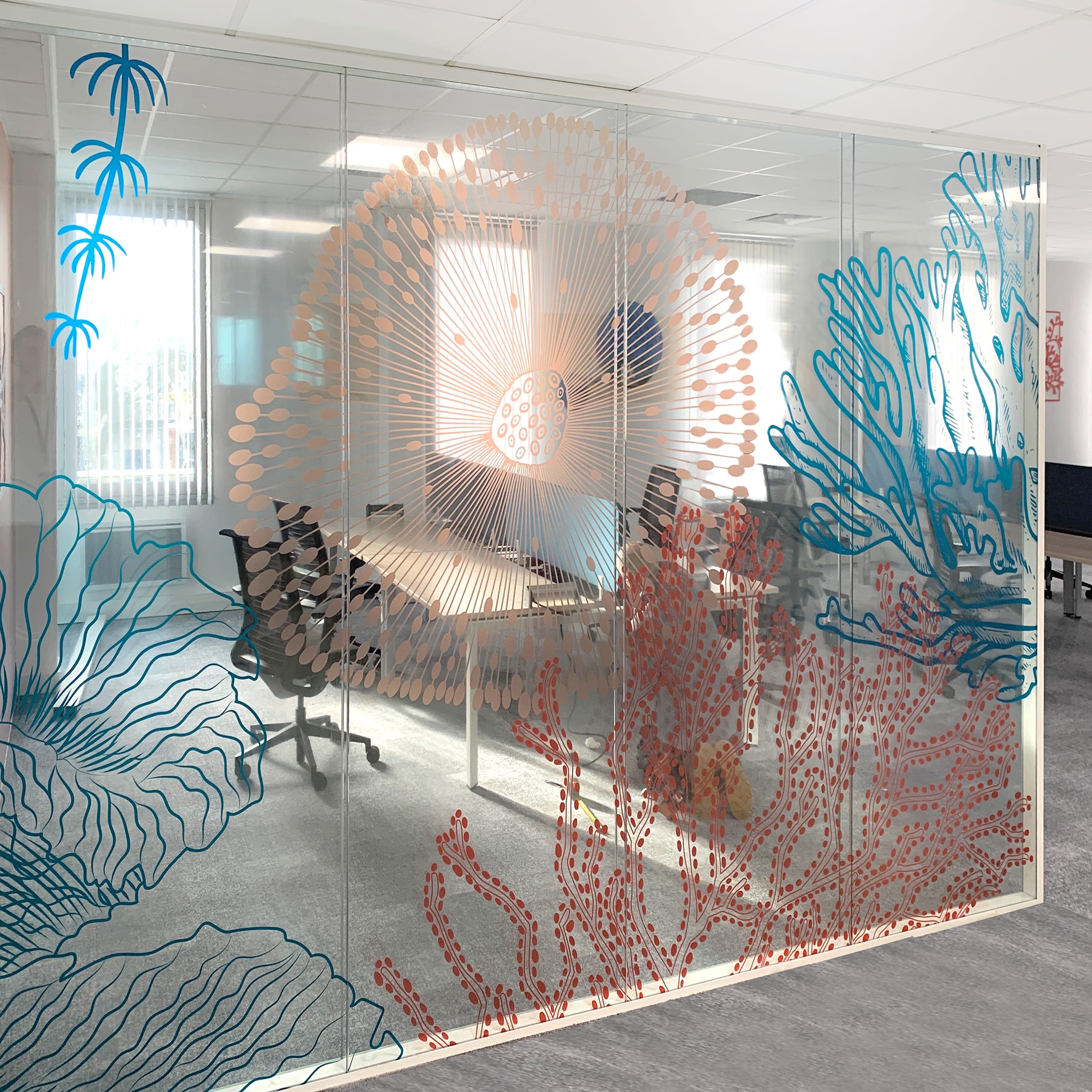 Cut-out vinyl and glazing add an interactive dimension, while seamless visuals mask damaged walls, creating an impressive visual continuity. Every element, from adhesives to decorative objects, has been designed to immerse employees in an inspiring and immersive experience from Building 1 to Building 2.