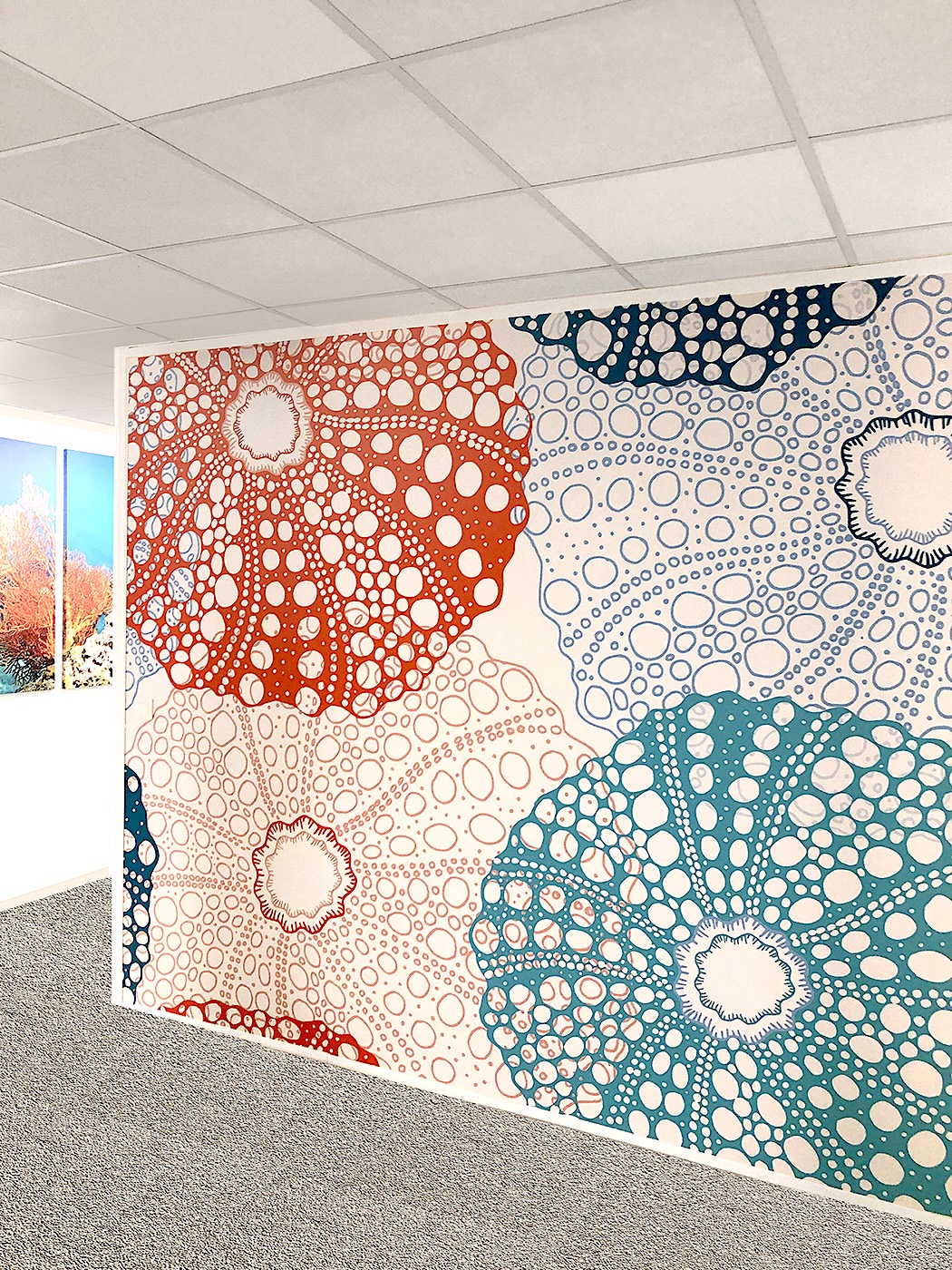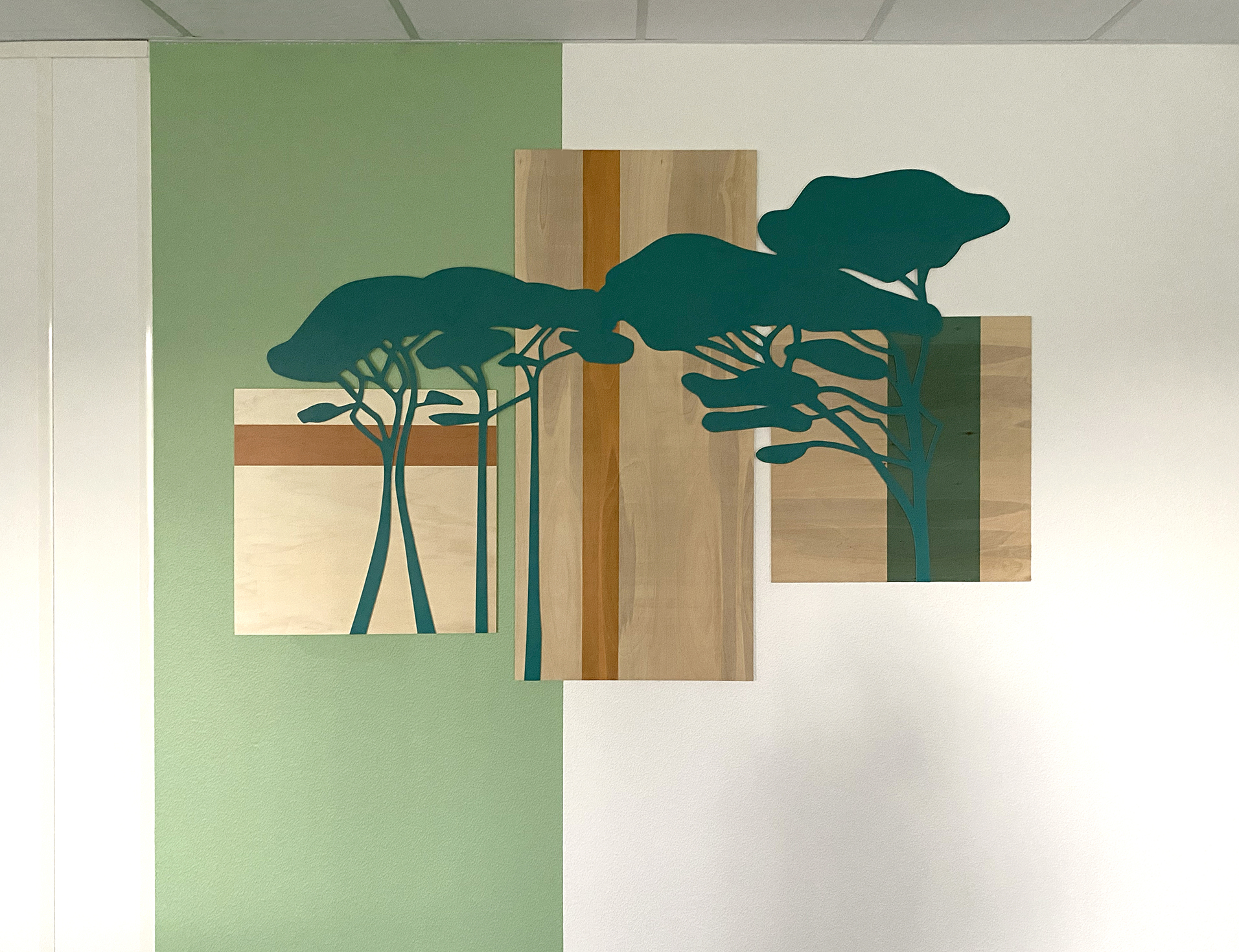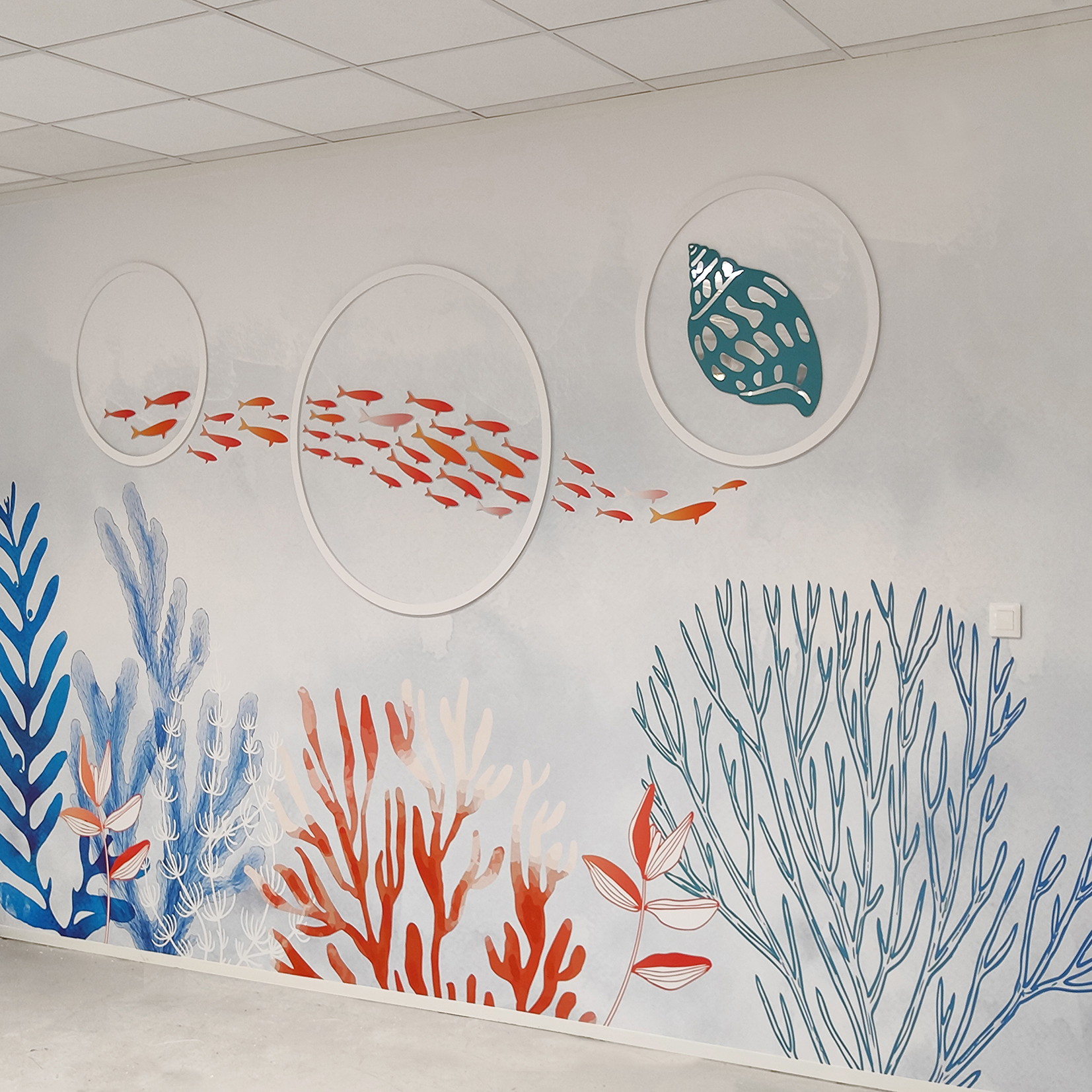 The murals were mainly printed on PVC-free materials. Decorative elements inspired by nature were printed and cut on M1-rated wood.