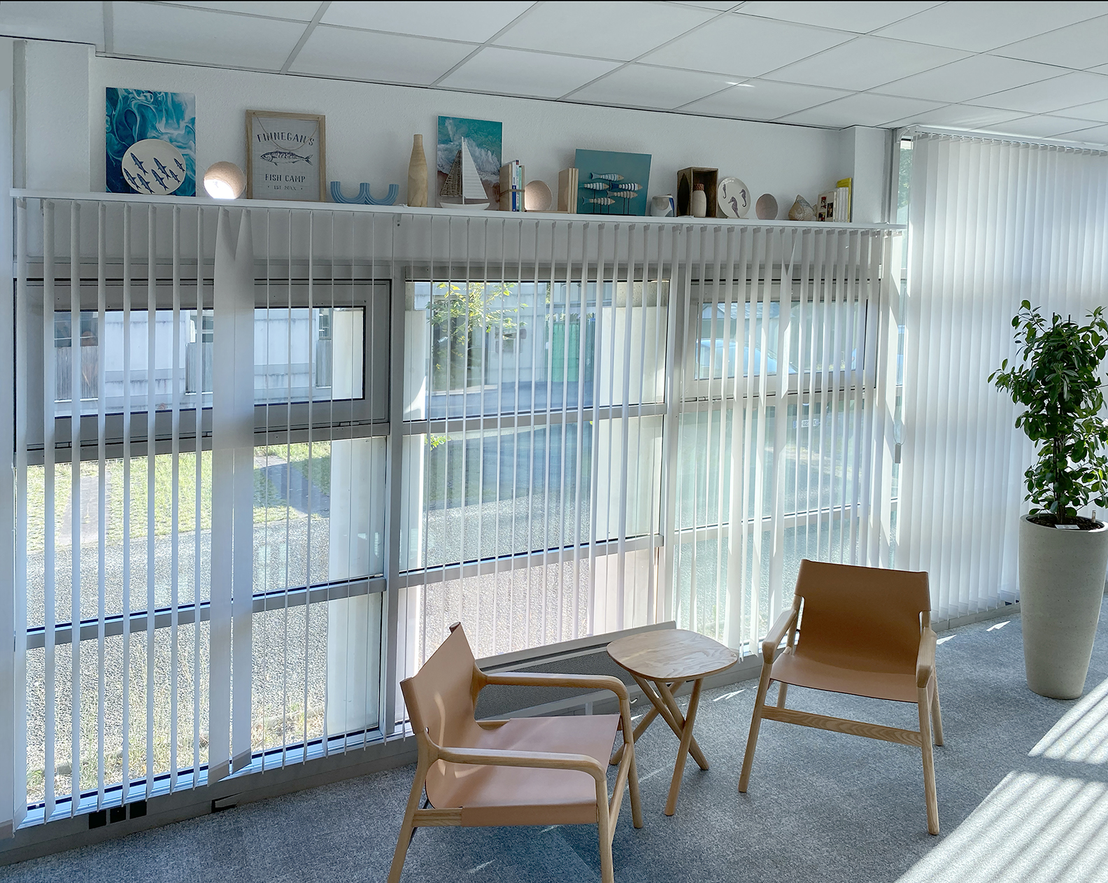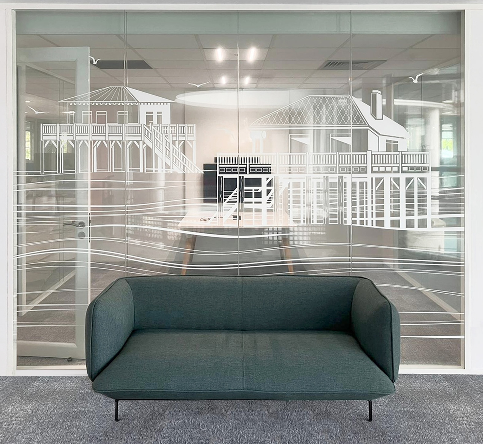 We used recycled materials such as polished glass, shells and wood to create decorative frames that illustrate our commitment to the environment. The decorative windows, made from frosted adhesive for added privacy, plunge employees into a stimulating underwater world (Buildings 1 & 2).