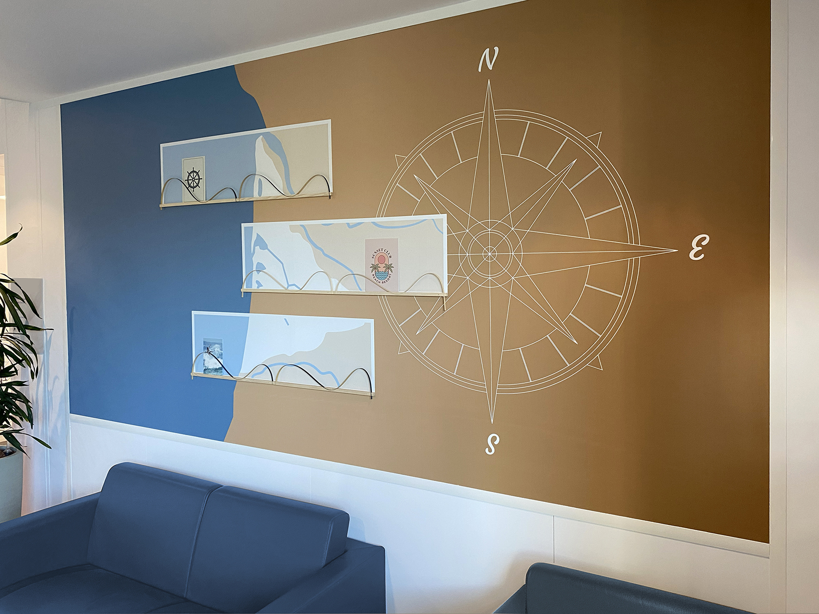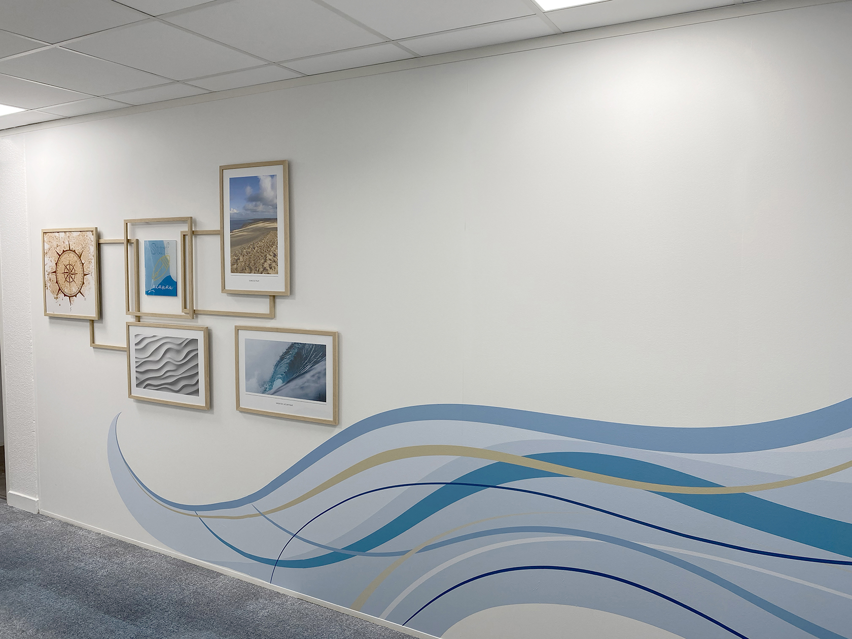 The building's ground floor, entirely designed and conceived by our teams, evokes the wild Atlantic, welcoming staff with delicate waves at the entrance and amplified movement in the corridors. The blue tones, from sky to navy blue, embody the power and serenity of the oceans.