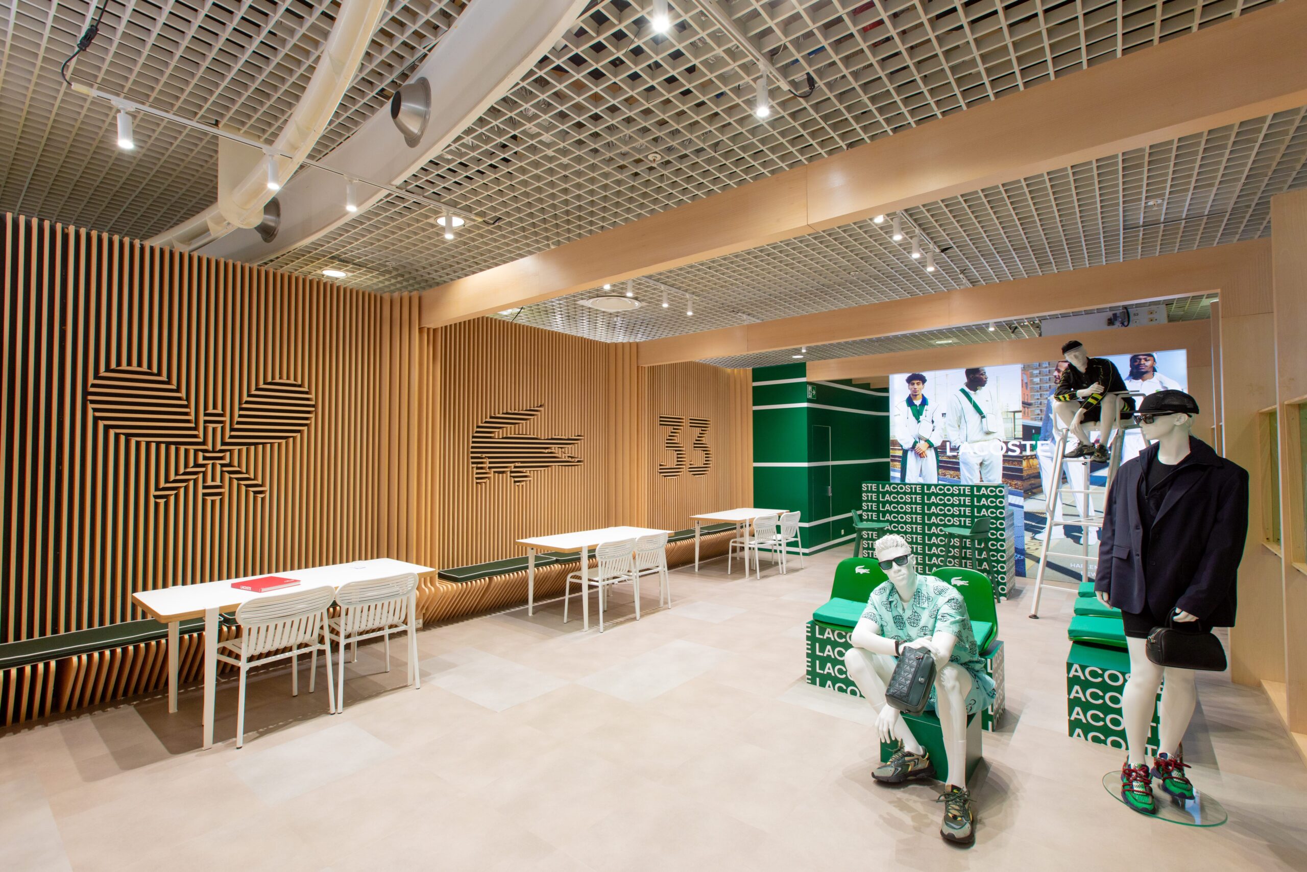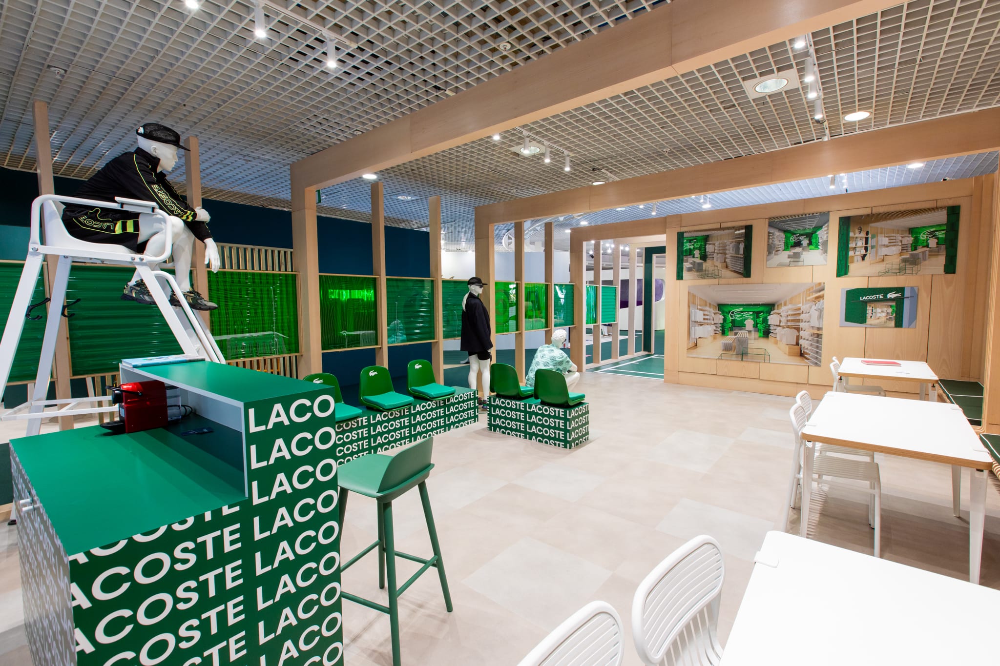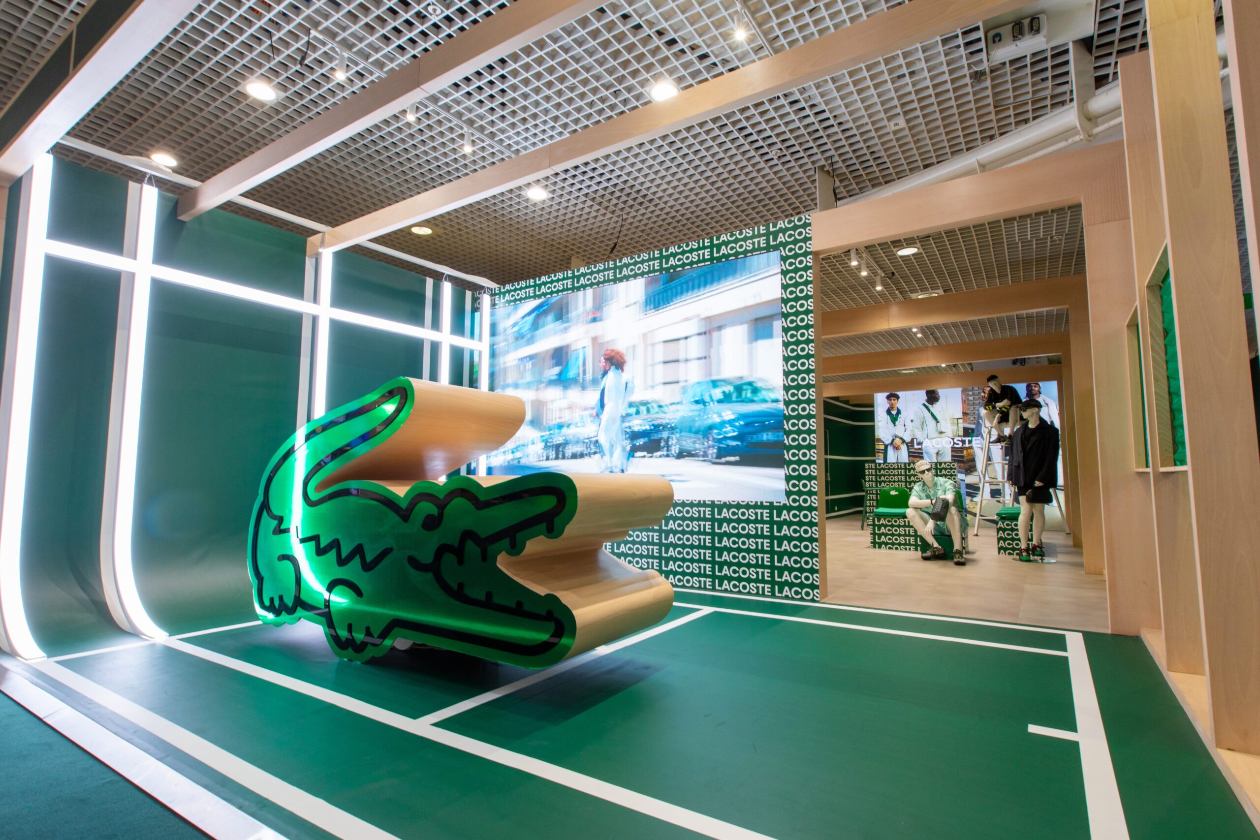 The Lacoste stand presents the concept of the boutiques that will be found in airports. For next season, the brand has come up with a design inspired by tennis, the sport with which it has a strong historical link.