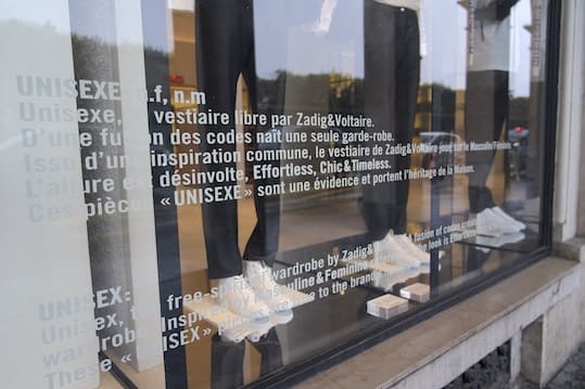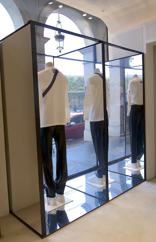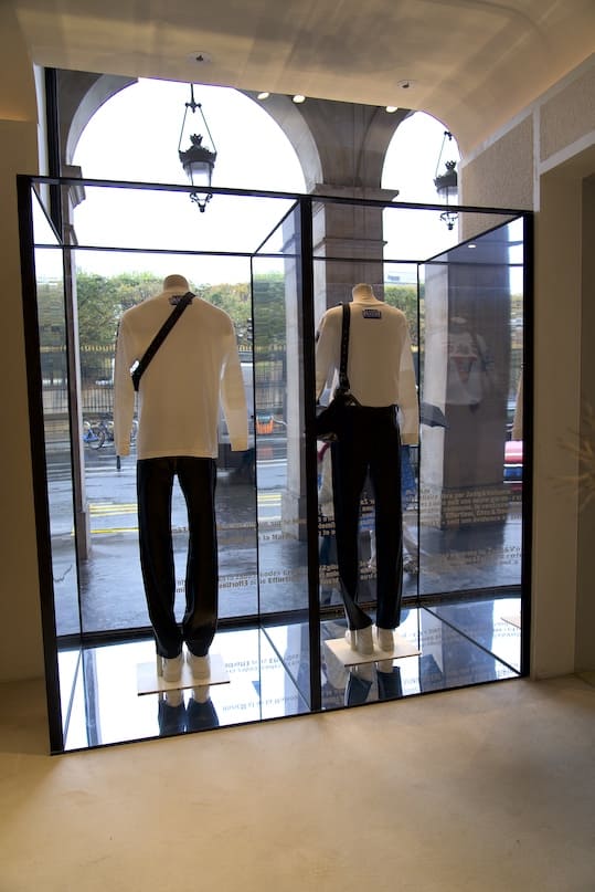 To highlight these unisex silhouettes in the window displays, we designed metal structures that play with symmetry and a clever play of reflections multiplied by mirrors. The result symbolises the fusion of genders, a fashion where women and men play on codes to offer a modern wardrobe.