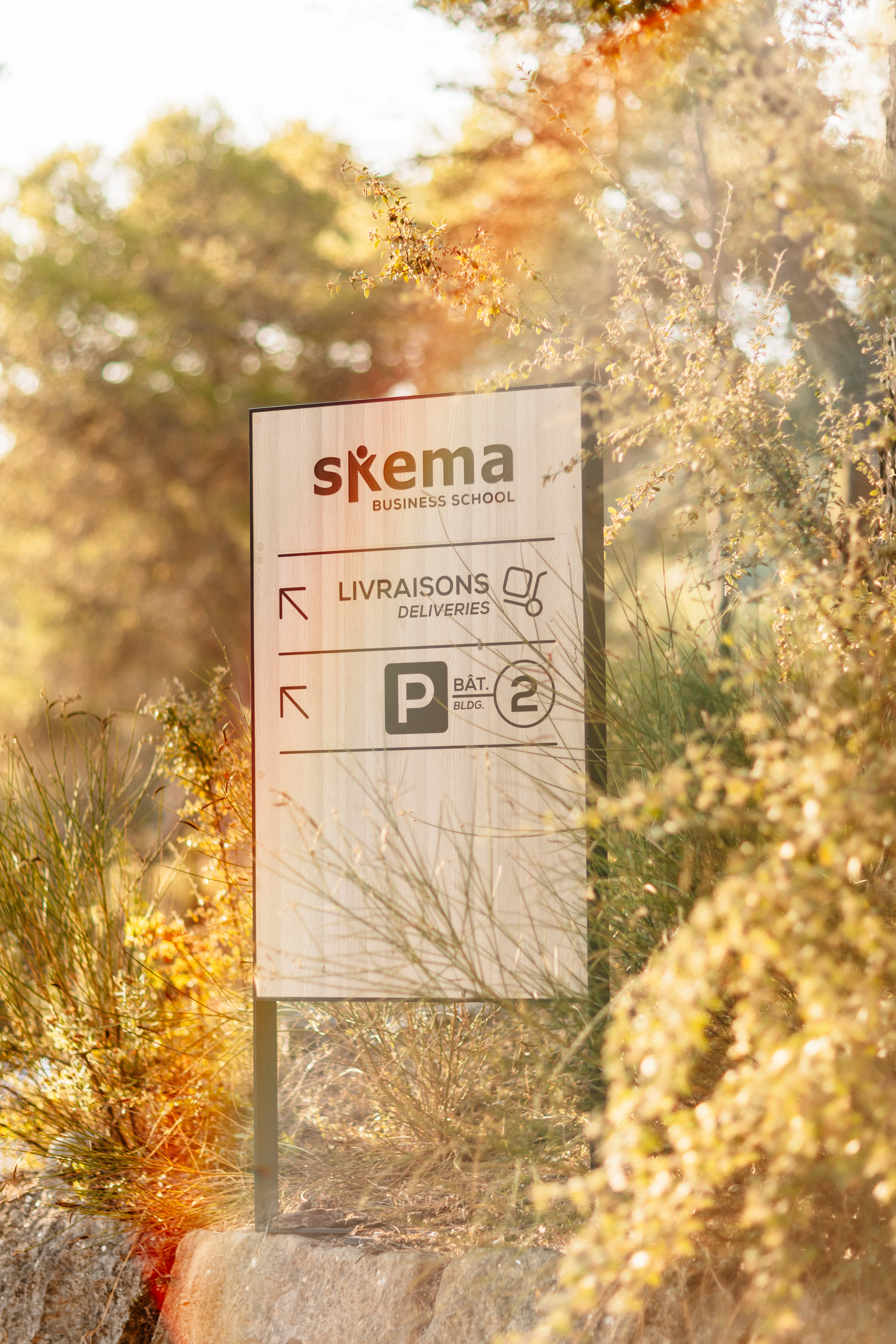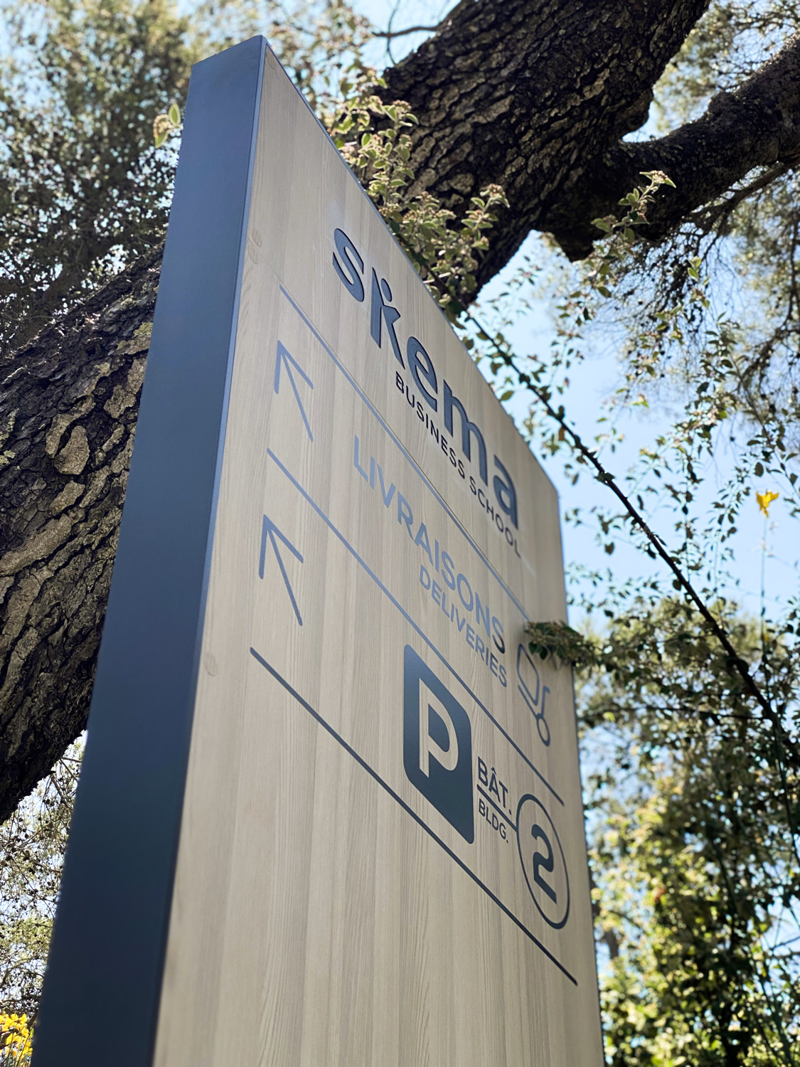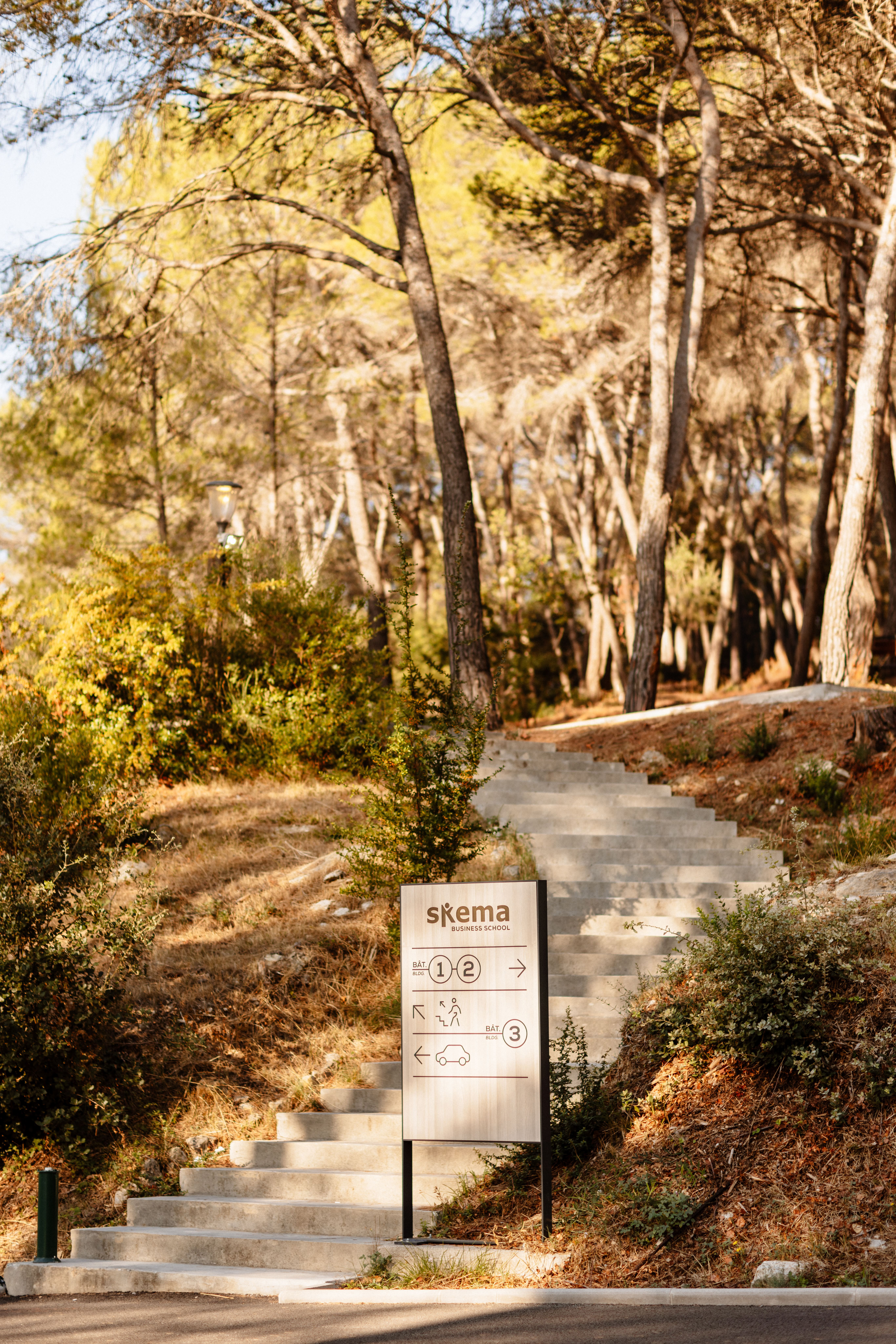 Le campus Sophia Antipolis de SKEMA Business School prend un nouveau souffle visuel. Entre nature et modernité, le parcours extérieur se transforme grâce à une signalétique pensée pour guider et harmoniser l’espace. Modernité, lisibilité et intégration à la pinède étaient au cœur du projet.