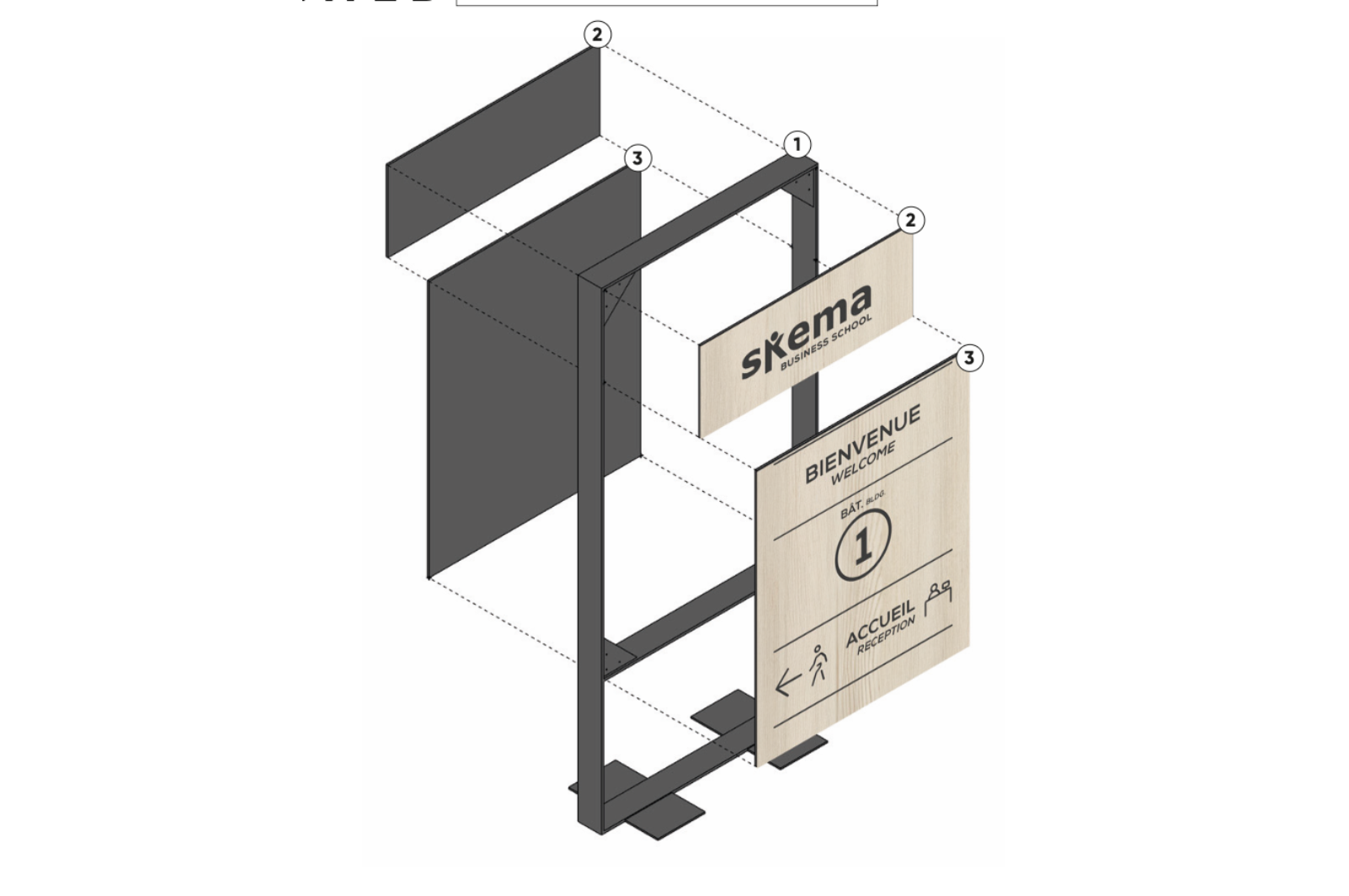 Nos équipes EG Space ont été missionnées pour repenser entièrement la signalétique extérieure. Douze totems sur mesure ont été créés, avec un aspect bois chaleureux et deux modèles lumineux équipés de LED, alliant gravure directe et adhésifs découpés à la forme. Chaque élément a été pensé pour s’intégrer naturellement au campus, tout en reflétant l’identité visuelle de SKEMA.