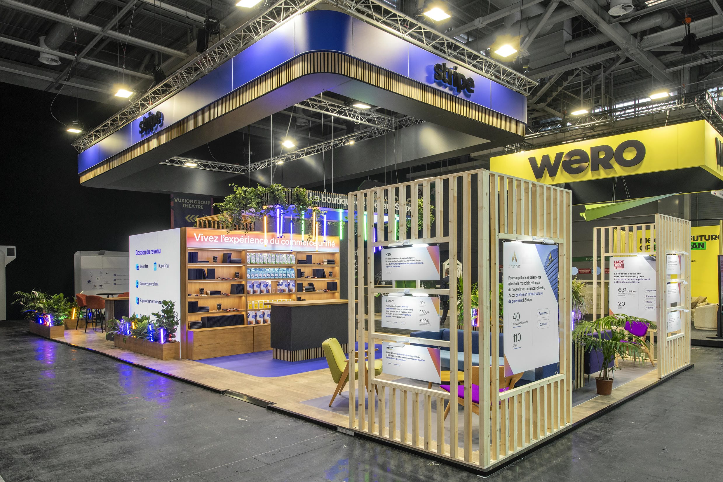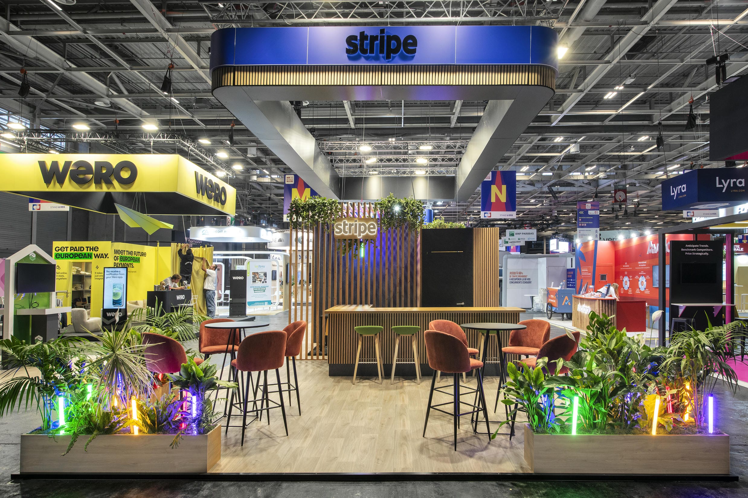 Imaginé par l’agence Boldie et réalisé par nos équipes, le stand Stripe se distingue par une scénographie vibrante mêlant bois, couleurs flashy, néons fluo et végétation. Au centre du dispositif : une mini-boutique “goodies” permettant aux visiteurs de tester directement la solution de paiement, tout en repartant avec un souvenir. Une approche expérientielle qui place l’usage au cœur du parcours.
